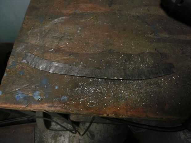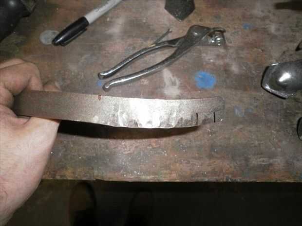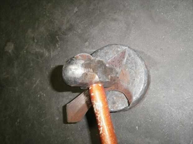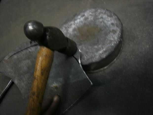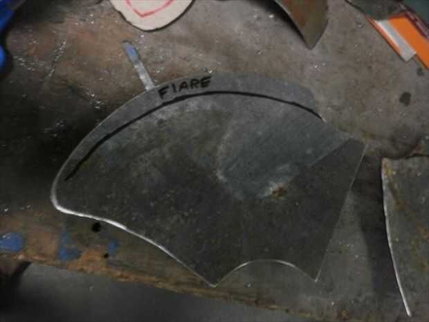 Para flare el inicio del borde marcando la línea que desea flare en. Lugar siguiente de la línea de un borde suave (en este caso el borde del plato, al borde de un tocón o incluso un 2 x 4 sujeta en un tornillo de banco trabajará demasiado.) y comienza a martillo el borde hacia abajo. Solo hacerlo un poco a la vez, utilicé 2 pasos para encender la llamarada de estas placas.