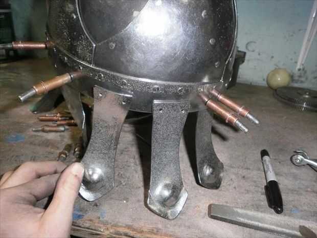 A continuación haremos el listón hacia atrás. Empezar por darles una pasada rápida en el plato bajo, que añade un poco de compuesto curva a ellos y hacerlos un poco más fuerte, más parece mejor IMHO. Un poco de aire extra realzado jefes poco en ellos la misma forma que hice para la placa superior. a continuación perfore un par de agujeros en las esquinas superiores de cada listón y marque y perfore agujeros correspondientes en la parte superior del casco. Yo sólo espaciados los listones uniformemente alrededor de la espalda entre las placas de la mejilla, salió a ser un poco menos de una pulgada entre cada listón.