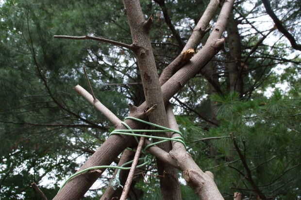 Tomar la cuerda colgante y enróllelo alrededor del tipi para mantenerlo todo junto.