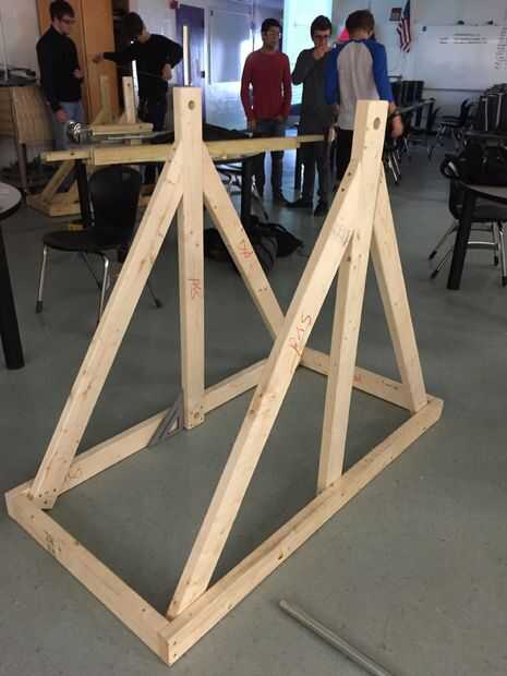 La primera parte de la trebuchet que estamos poniendo juntos va a ser el marco. La madera vamos a usar dos es 28" pulgadas de 2 x 4, de dos 5' 2 x 4, dos 50" 2 x 4 y cuatro 58" 2 x 4. Para el hardware que utilizamos 2" tornillos para madera. También utilizamos madera contrachapada como cerchas de apoyo. No olvides perforar 1' 1/ 8'' a 50'' piezas de 2 x 4. Recuerde utilizar un cuadrado de la velocidad a mantener alineados correctamente.