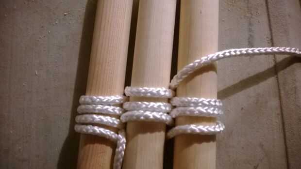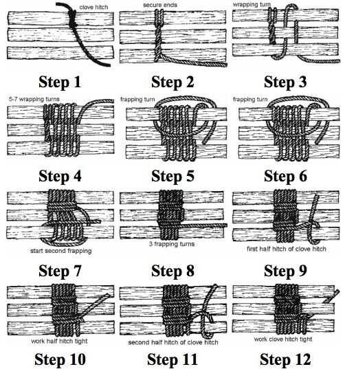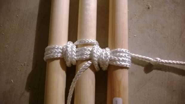 2. ahora toma el extremo más largo y enrolle vertical entre cada uno de los polos de varias pasadas, envolviendo en sus cintas anteriores y agregando fuerza significativa a la plataforma. Esto se conoce como frapping. (Tenga en cuenta que la imagen de la izquierda es solo las trincas acabados mientras que el de la derecha es el frapping terminado).