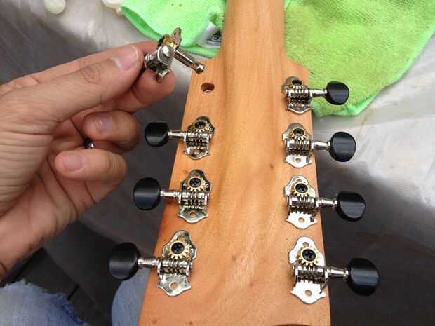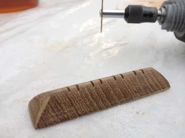 Comprar sintonizadores de ukelele y no ser barato. El resto del instrumento era gratis así que por lo menos obtener algunos sintonizadores buena. Esto le ayudará a mantener que las 8 cadenas sintonizan que no constantemente está haciendo que su audiencia espera mientras que usted ajuste. El puente es una pieza libre flotante que contiene las cadenas en lugar de que, a su vez, mantener el puente en su lugar. Es una relación simbiótica. Éste se redujo de teca y tiene cuatro pares de ranuras para las cuerdas. Su distancia de la tuerca aparecerá en el calculador de trastes usted descargado antes pero no pega en el lugar. Las cuerdas se estar atadas a un clavo tachuela de dos caras, que parece algo primitivo, pero si es lo suficientemente bueno para Andre es lo suficientemente bueno para usted.