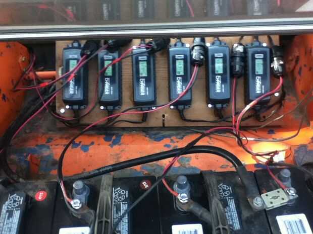 Basado en los tipos de baterías tienes debe tener el cargador correcto. Para baterías de plomo ácido puede obtener un solo cargador o un cargador para cada batería. Elegí tener un cargador para cada batería, esto evitará que cada batería en su mejor rendimiento. Si un cargador va mal puede reemplazar a un cargador a un costo mucho menor. Mi costo fue de $25 cada uno y el cargador tiene la capacidad para mantener la batería y carga en 3.8 amp. Esto funciona perfecto para mi situación.