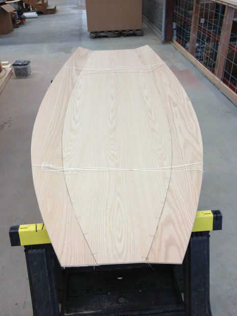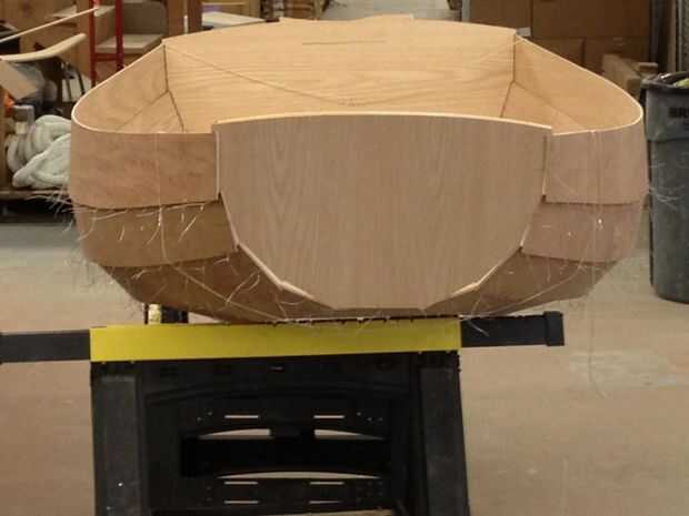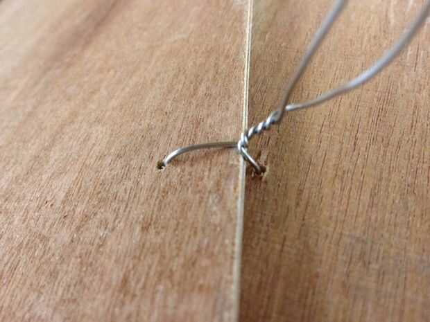 Las puntadas van desde adentro hacia afuera. Corte 6" longitudes de alambre y doblar en largo, estrecho U que tienen el ancho de la distancia entre los agujeros. Pega los extremos por los agujeros y cuidadosamente Trence las colas en el exterior del casco, asegurándose de no dañar la madera. Si estás utilizando abrazaderas de plástico, entonces los agujeros que tendrá que ser más grande y tendrás que empezar en el exterior, ir, regresar, luego, luego "zip".