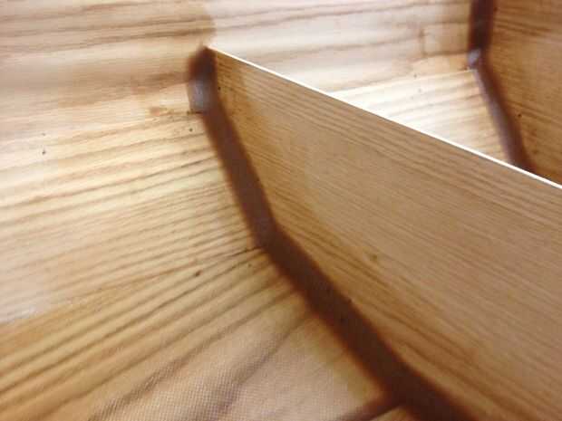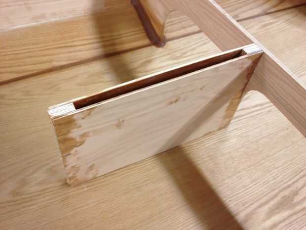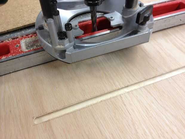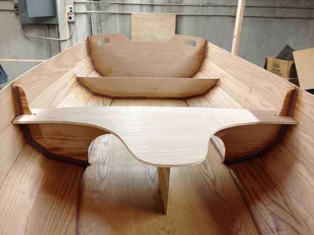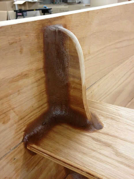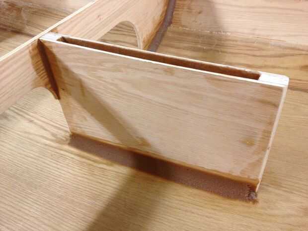 A continuación, vamos a hacer la ranura de la orza en el centro de frustrar. Configurar un borde recto con una broca de espiral upcutting. Asegúrese de que ampliar las ranuras en el extremo de la frustre centro por lo que puede caber alrededor de los filetes de la mampara del centro. Ahora es el momento para aliviar los bordes de la centro frustrar porque usted va sentado en él mucho, por lo que necesita estar cómodo. Porque es tan delgada, sólo enruta el borde superior de la frustre de centro que muestra y justa mano lija el borde por debajo (es muy problemático hacer una ronda en poco en la segunda parte de una junta). Pintar todos lo frustra con tres capas de epoxi espesado, especialmente la parte inferior. Una vez hecha la carpintería, el frustrar puede se ajustaron en su lugar con mantequilla de cacahuete (o puede ir a cortar la ranura de la orza en la parte inferior del casco). Asegúrese de que la frustre quepa comodamente en lugar. Toques de mantequilla de maní de la gota en los bordes superiores de la caja de mamparo y orza de centro y repartidos uniformemente (Asegúrese de que ninguno obtiene dentro de la ranura para interferir con la orza). Firmemente el frustrar (valga la redundancia) el asiento en el goop y peso hacia abajo. Dejar curar durante la noche.