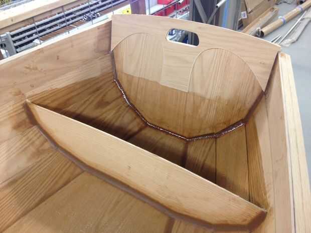 Mientras estás haciendo los pasos anteriores, si estás en una contracción del tiempo, seguir adelante y construir el tronco orza. Se hace de numerosas piezas que son previamente recubiertas con dos capas de epoxi espesado, pegadas con epoxi espesado de sílice. Esto lo hace fuerte y resistente al agua que estará por debajo de la línea de flotación así debe ser totalmente impermeable.