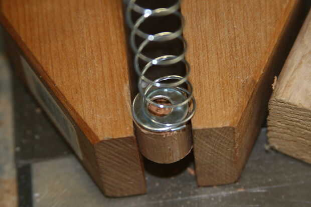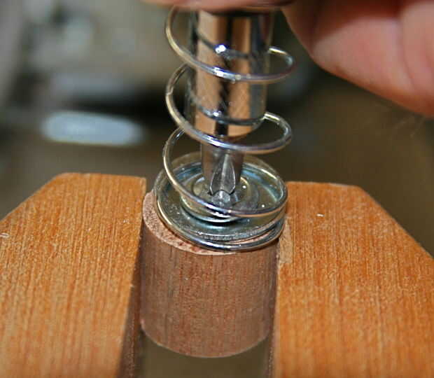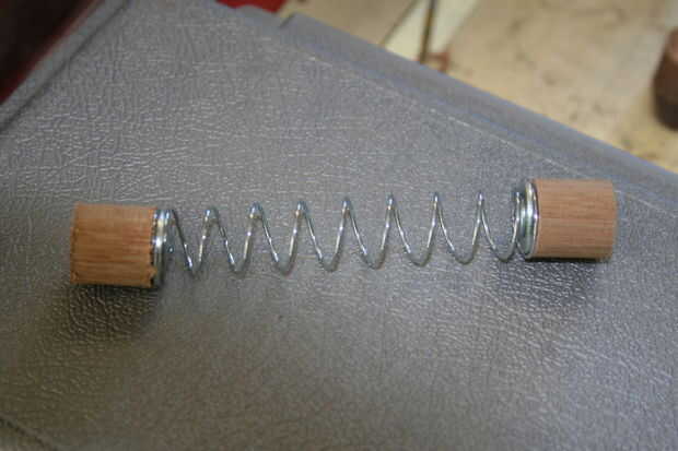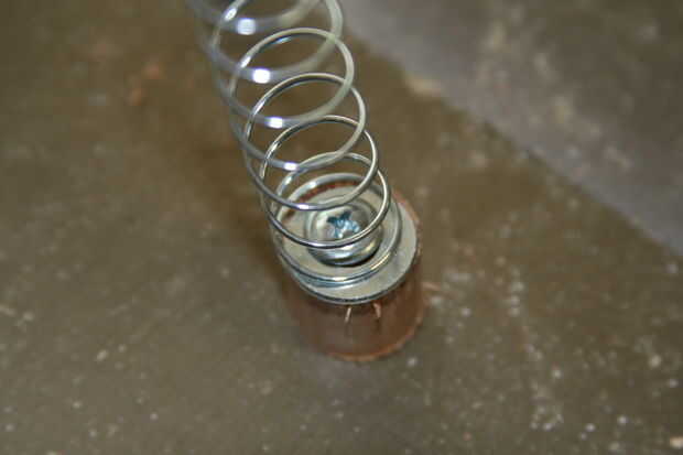 Primero necesitará perforar un agujero guía de 1/8 de pulgada a través del centro de ambos sus enchufes. Utilizar una pinza para sujetar el tapón en su lugar. Ahora para la parte difícil. Coloque la lavadora 3/4 de pulgada sobre la base de su resorte y alinee con la clavija, tratar de hacer tan al ras como sea posible. Atornille firmemente la arandela y el resorte en su lugar, puede hacerlo a través del lado de la primavera. Repetir este proceso para ambos extremos de la primavera.