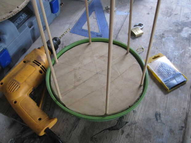 Los 6 orificios para el pasador de arbolado se perforaron con soportes espacian alrededor de la circunferencia de la placa base con la ranura para la malla interna que les corte. El agujero para la luminaria fue hecho por una punta de pala. Para más información ver aquí.