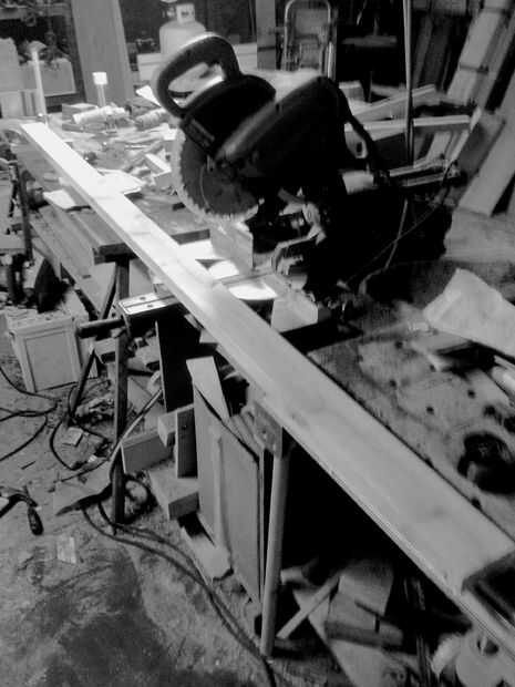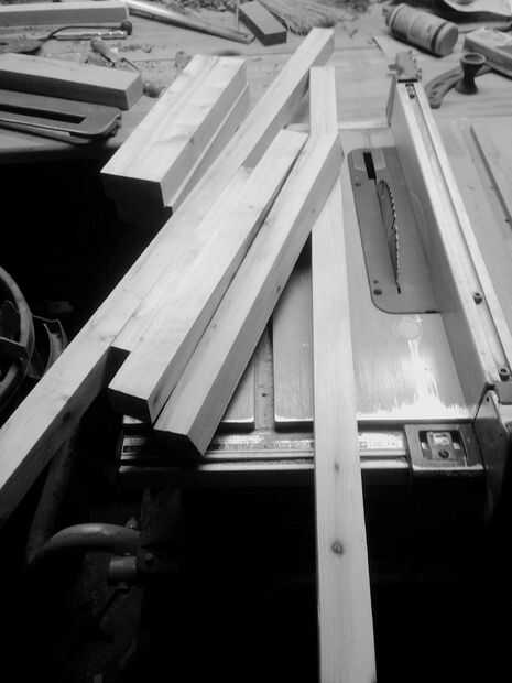 -El primer paso es hacer los cortes principales para dividir el 2 x 4 en las porciones para el asiento, las piernas, y conectores con una chuleta de la sierra.
