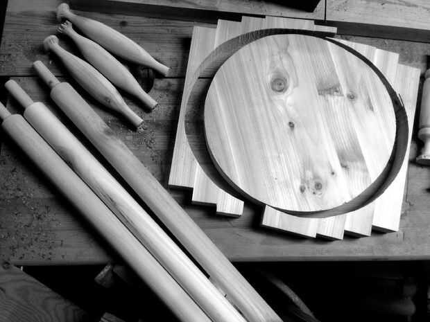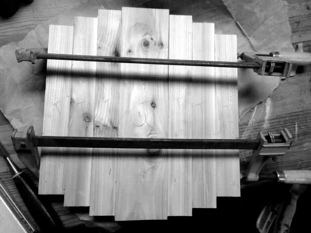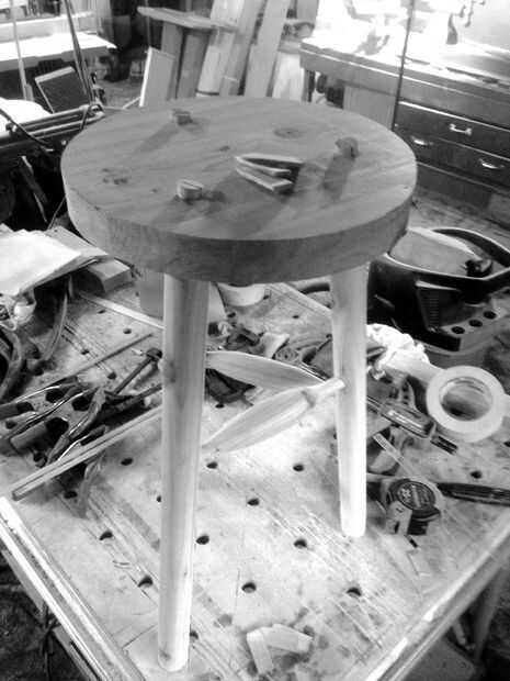 -Mientras tanto, las piezas para el asiento del taburete son laminadas juntos para formar un bloque sólido.