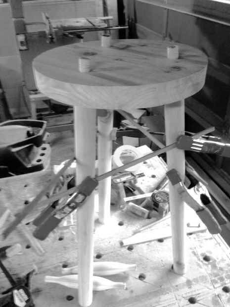 -Pegamento se aplica a cada clavija y clavija en el asiento, patas y conectores. Un tubo de la bicicleta es una gran manera para sujetar firmemente las piernas. -Una vez todo lo justo, son recubiertas con pegamento y conducido en la parte superior de las piernas que se pega a través de la sede para fijar permanentemente todo juntos.
