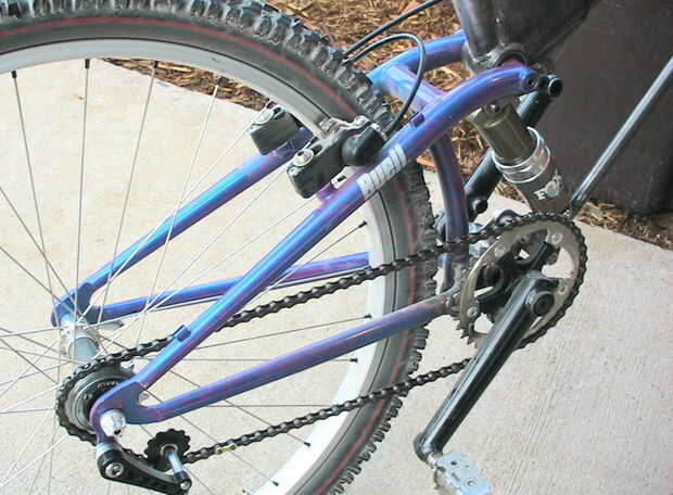 Originalmente el extremo posterior fue utilizado en una de las motos Scwinn Buell viejo-montó bastante horribles. Lo modifico por la soldadura en una caja del pedalier y platos adicionales para montar las bielas y plato adecuada separación. En algún momento soldará con autógena para arriba un nuevo propósito construido triángulo trasero con vainas levemente más larga que es un poco más ligero, pero para esta "prueba de concepto" bicicleta el triángulo trasero de Buell funciona bastante bien.