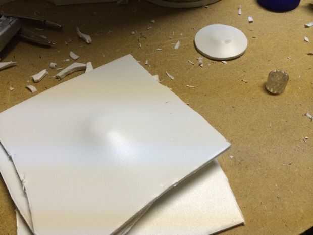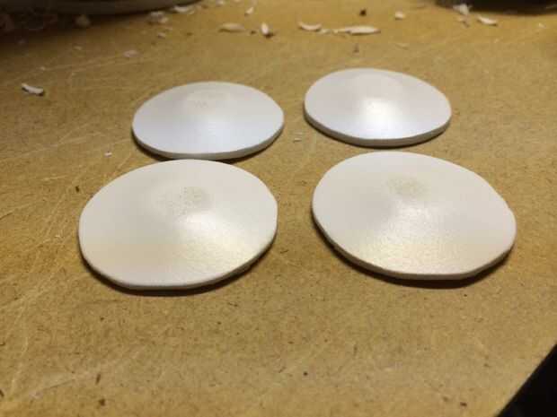 Las tapas en la parte superior e inferior de los depósitos de combustible fueron un poco difíciles de averiguar. Lo que terminé haciendo fue calentar una pequeña plaza de sintra y luego presionando sobre un pequeño trozo de tubo para dar a cada una de las piezas de una forma uniforme y altura. Entonces, usé un compás para dibujar un círculo del diámetro adecuado desde el centro de la forma levantada. Corté las líneas para terminar las tapas.