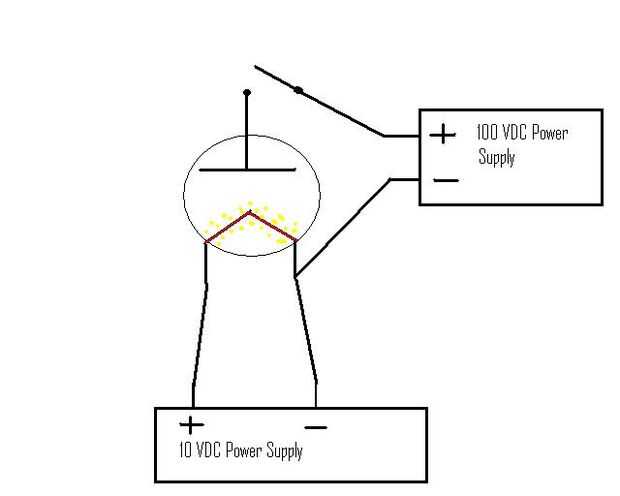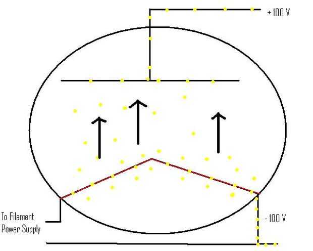 Ahora, vamos a echar un vistazo a la foto 2. Aquí hemos aplicado un voltaje entre el filamento y la placa. El filamento está cargado negativamente y la placa se carga positivamente. Mientras que son atraídos los electrones del filamento a la placa, no hay suficiente voltaje para que puedan hacerlo en su propio. ¿Cómo podemos conseguir que salte? Echa un vistazo en el cuadro 3.