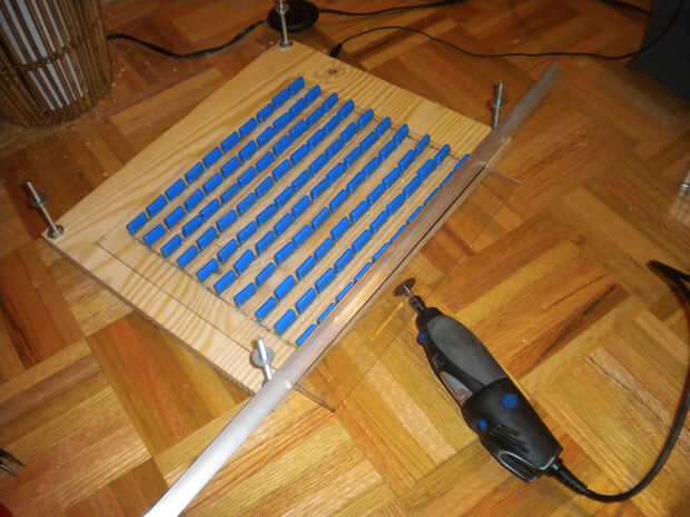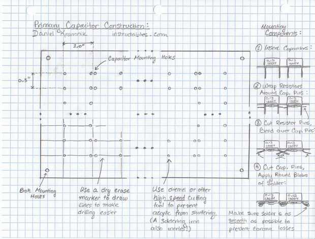 Construcción física del Banco de capacitores no es muy importante. Utilicé un cuadrado de plexiglás que perforé con 200 agujeros para montar los condensadores y resistencias (ver primera foto). Sin embargo, para facilitar las cosas, dibujó un diagrama (imagen 2) que explica como perforar la placa y montar los componentes. Ver la imagen de tamaño completo para una mejor legibilidad.