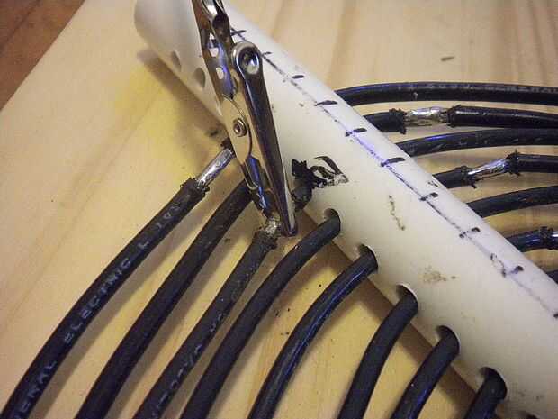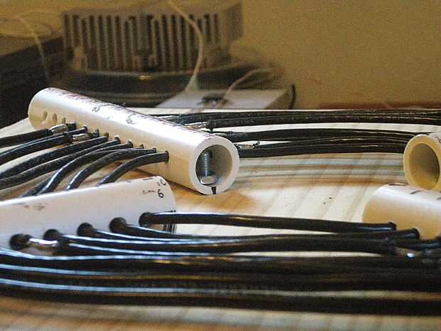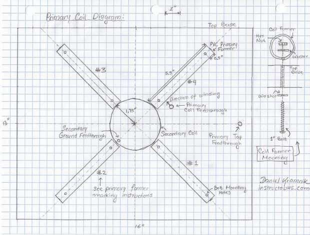 Usé 4 soportes hechos de 1" por 6" PVC tubería empernado a la base de madera. Aquí es como marcado y perforado para la bobina primaria de la ayuda: