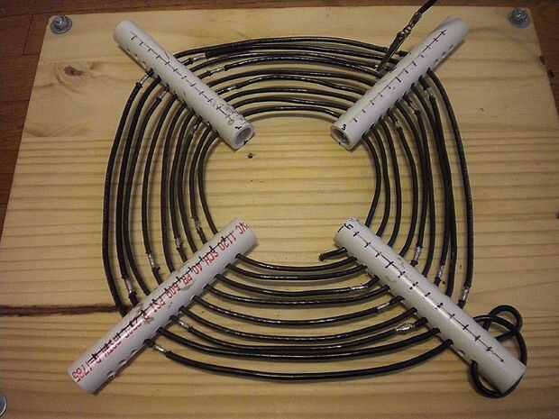 Para mi bobina primaria, usé una espiral plana de 9 vueltas de alambre grueso trenzado con 0,25" espacio aprovechado cada cuarto de vuelta para afinar. Si usted puede pagar por utilizar un tubo de cobre flexible, te recomiendo que hacerlo porque es más fácil de afinar y trabajar con que cable aislado.