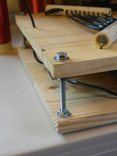 Si usted está construyendo una bobina de Tesla significativamente más potente que lo hice, no puede ser la mejor idea de utilizar madera en su diseño. La madera no es un aislante en altas tensiones y en un día húmedo, podría encontrar que su circuito primario a través de la madera del arco y comenzar un fuego. Por lo menos, no montar los componentes eléctricos directamente sobre la base de madera, usar plexiglás, acrílico o aisladores de cerámica o plástico siempre que sea posible. Esta no es una preocupación a menos que usted está bombeando un kilovatio o más en su bobina. (Un NST de 30mA 9kV sólo dibuja sobre 270W).