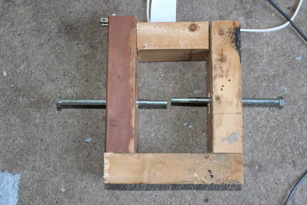 Bastante simple. Cuatro piezas de madera cortan al tamaño, en una plaza. Taladro en su totalidad en dos de los lados en medio de la Junta. Ponga dos inoxidable robar tornillos aunque los orificios, asegurándose de que tiene suficiente espacio para ajustar, pero no demasiado tanto caen. Me doy cuenta que hay muchas maneras de que esto podría hacerse más eficiente, pero no estoy tratando de construir la bobina de Tesla perfecto aquí.