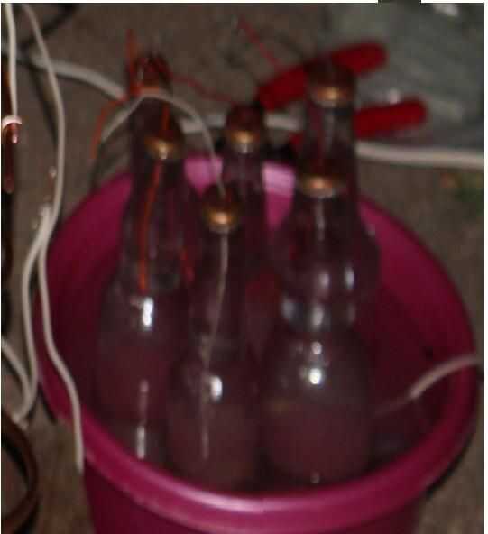 he utilizado seis botellas de cerveza de raíz. Haz tus botellas, llenarlos con agua con sal de 3/4tas el camino, entonces el resto del camino con aceite de bebé. La cantidad de agua salada en las botellas debe estar cerca de la misma, la forma más sencilla de hacer esto es hacer un galón entero de agua salada y después viértalo en cada botella. El agua salada no tiene que llegar al punto donde no puede absorber más, pero cuanto más sal mejor. Luego peguen todo al lado de cada uno, perfore un pequeño agujero en cada uno de los y pegar un cable aunque cada una de las tapas, hasta el fondo de la jarra. Luego conecte todos los cables a un cable en la parte superior de los condensadores. Hay dos formas de hacer este bit siguiente. Mayoría de la gente dice envolver a cada una de las botellas con papel de aluminio y luego conecte la lámina, pero que parecía tedioso para mí, así que no lo hice. En cambio, sólo poner en un recipiente llenado de agua salada y utiliza como el otro extremo de mi condensador.