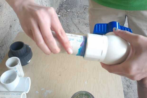 1. Tomar la Unión de 1 1/4" a 1 1/4" x 3" PVC. Sacar la cartilla de PVC y cuidadosamente aplicar el borde exterior de la tubería de PVC y luego coloque el cemento sobre la y poner cemento en el interior de uno de los lados de la Unión. Inserte el PVC en la Unión y torsión.