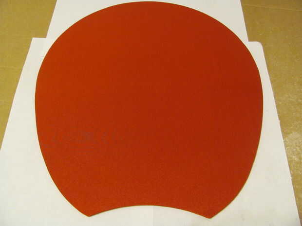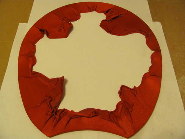 9 - cuidadosamente dé la vuelta a la pieza de la oreja para que la sección rociados con el adhesivo enfrenta a la tela rociada. Ahora pone sobre la tela, asegurándose de que hay un área uniforme de tela alrededor del borde de la oreja. levantar y voltear la pieza una vez que la tela se pega a él y comenzar a alisar hacia fuera la tela, asegurándose de que no hay arrugas ni zonas elevadas hasta la tela limpia se pega a la pieza.