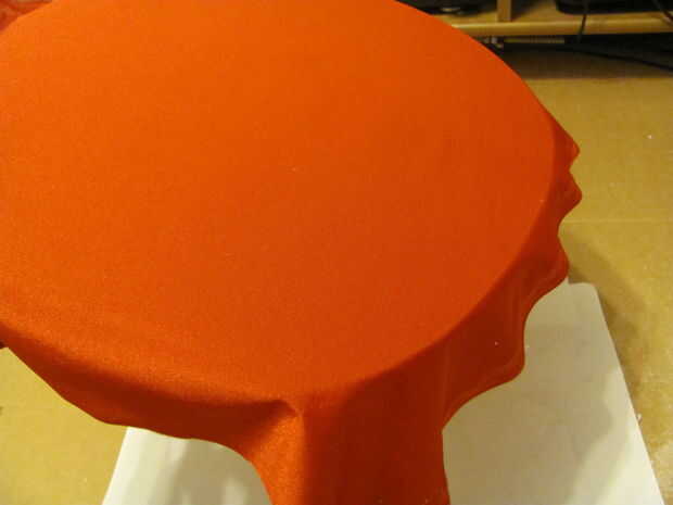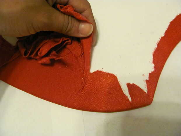 10 - volver a voltear la pieza y colocar la sección arrastrada de la tela hacia fuera para ser rociado con el adhesivo. Comience a rociar el resto de la tela, así como el perímetro de la pieza del oído que se pegue a.
