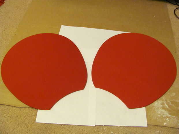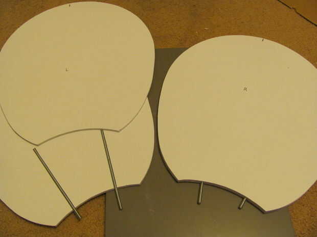2 - luego proceder a cortar las orejas con un cuchillo xacto, o en mi caso he utilizado un cuchillo para uso general, repita los pasos 1 y 2 para las otras 2 espuma base hojas. Deberás acabar con 6 piezas, 3 se utilizará para cada oído. La pieza interior llevará a cabo los tornillos de roscados mientras que las otras 2 piezas sandwich el pedazo de centro, como voy a comenzar a explicar en los siguientes pasos.