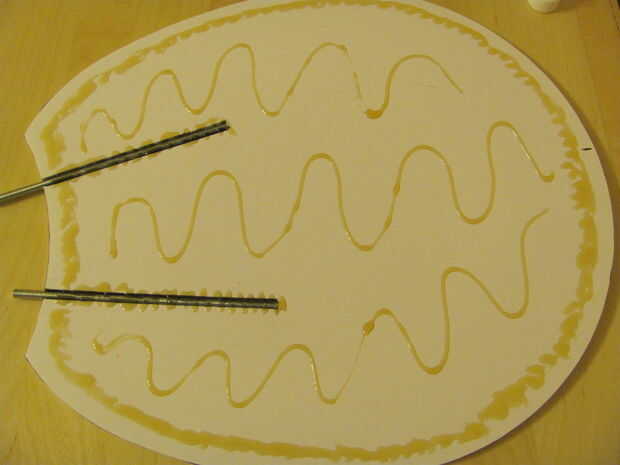 8 - mientras se espera para que estas piezas a seco, agarra las 3 piezas de cada oído correspondiente y colocar sobre la tela que se envuelve en. Corte una sección de tejido para cada pieza. Ahora spray adhesivo sobre un lado de la pieza mientras está sentado en la tela. Quite la pieza y rocíe la sección de la tela, en que la pieza se encuentra.