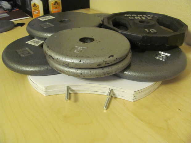 7 - apile las 2 orejas pegadas y añadir pesos en ellos. Ahora esperar para ampliar y secar el pegamento.