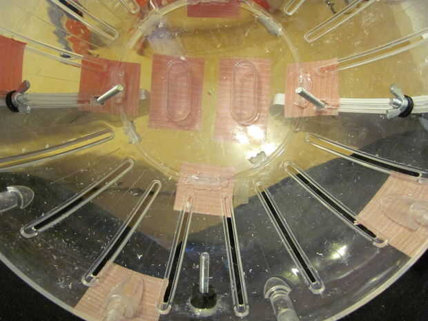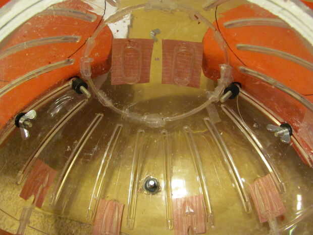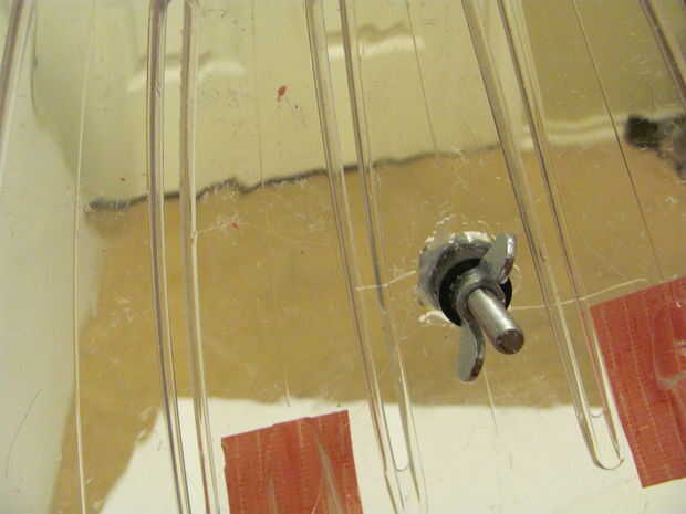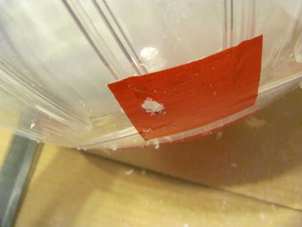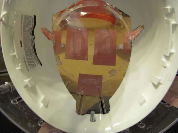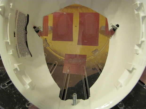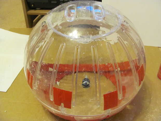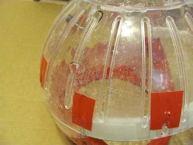 7 - colocar la cabeza en el casco como en el cuadro 9. Utilice un bolígrafo o algo que se ajuste a través de los orificios superiores en la cabeza para marcar en el casco donde estarán los agujeros para los hilos de rosca. mientras el casco está dentro de la bola Marque un punto en la parte posterior la parte trasera del casco y perfore un agujero a través y a través de la bola. Inserte un perno a través de esa parte posterior de la bola de hamster, y a través de la parte posterior del casco, necesitará añadir unas arandelas para rellenar el espacio entre el interior de la bola y el casco, refiera a los cuadros 11 y 12. He utilizado pegamento caliente para sostener el perno desde el interior, se trata permanentemente de la pelota.