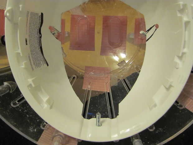 2 - ahora marca un lugar cerca de la parte delantera del casco como se ve en la segunda foto. O medir 9 pulgadas para arriba de la línea trasera, si tienes un casco diferente (véase el cuadro quinto para mediciones, cada tick representa una pulgada) si tiene el mismo casco como se muestra en la imagen, su marca frontal debe terminar alrededor de donde termina el bosque interior.