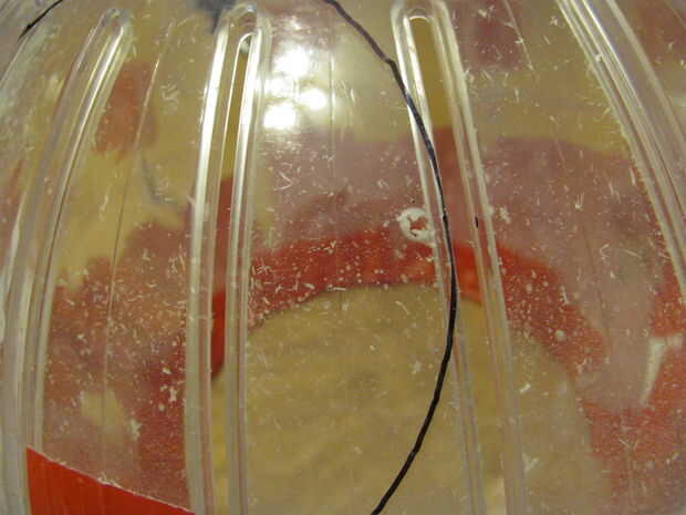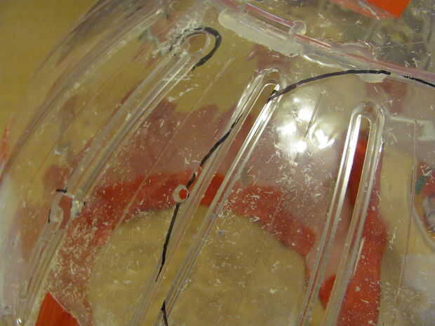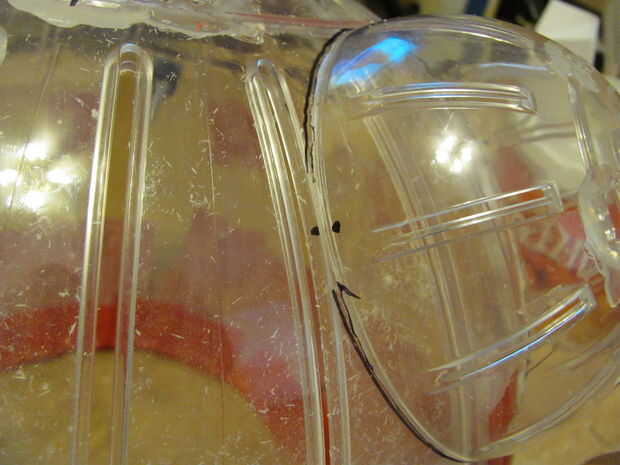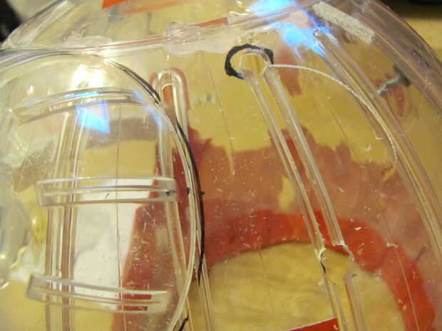 3 - ahora Taladre orificios en la cabeza donde las marcas de hecho como en los ojos. Asegúrese de no perforar demasiado cerca en el borde de los ojos para que el cordón no rasgar el plástico al atar.