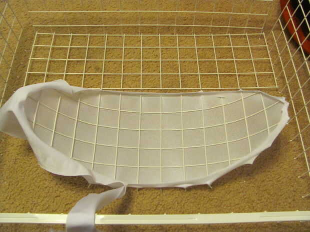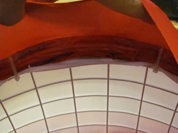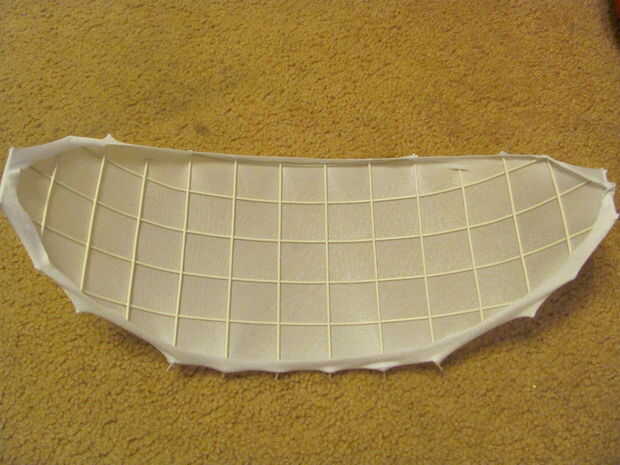 1 - cortar el perímetro de la parte inferior de la cesta de alambre, luego envolver toda la pieza por la zona de la boca de la cabeza de mau5 para obtener una buena idea donde hay que cortar el cable de tamaño. También puede intentar replicar a la pieza cortada en las fotos aunque si funciona. Quiere dejar un alambre extra colgando de la parte superior e inferior (aproximadamente 1/2 pulgadas). Usted tendrá que doblar los cables hacia afuera para que cuando la pieza se coloca en la boca, estos se hunden en la espuma de la boca y proporcionan estabilidad.