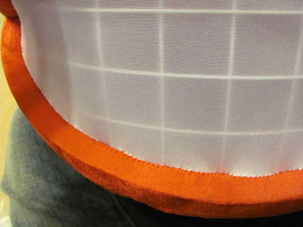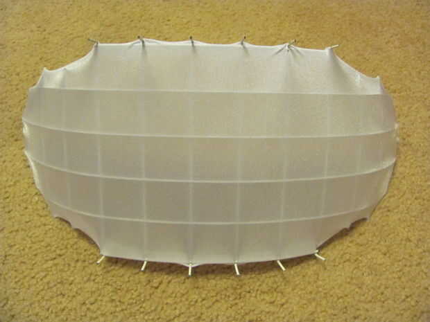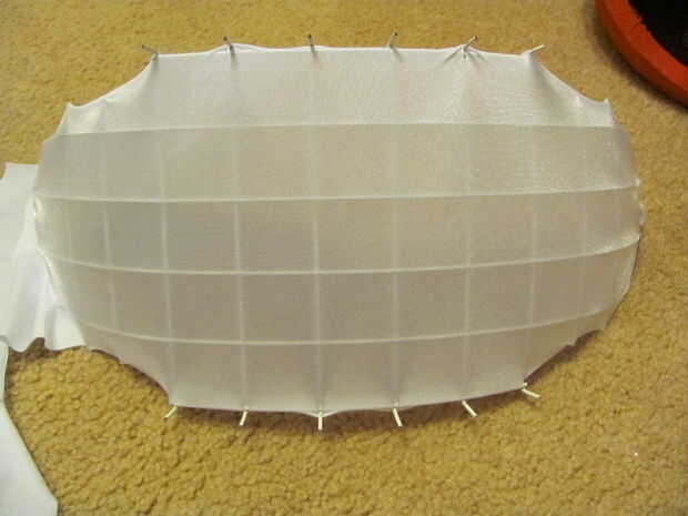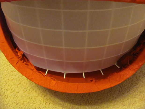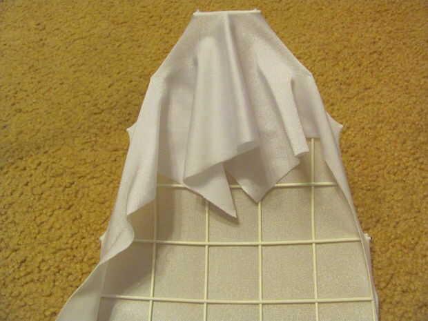 2 - colocar el cable cortado a la tela y corte alrededor del perímetro. Ahora comienza a estirar a la tela uniformemente en todas direcciones. Hasta qué punto estiran a la tela depende de cómo desea ver fuera de la boca. En mi caso la tela que usé era bastante gruesa así que tuve que estirar un poco. Conocer los límites de la tela aunque no quiere terminarlo rasgado. Corte cualquier exceso tejido colgando de los lados.