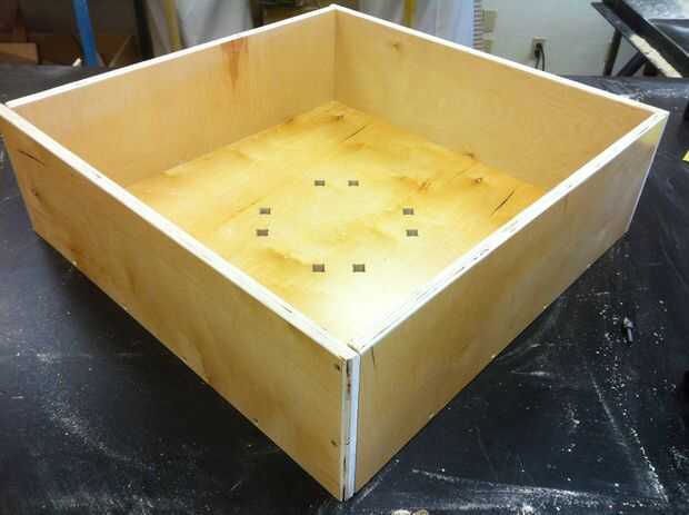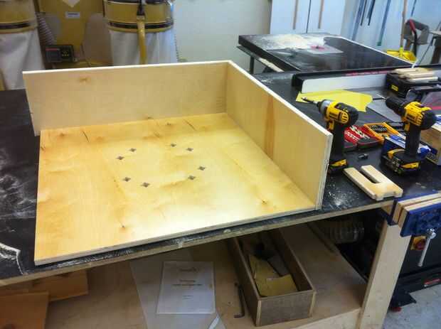 La forma más sencilla que encontré fue poner la base para arriba sobre una mesa y usar un cuadrado para mantener un lado recto taladrado y había atornillado en su lugar.