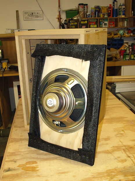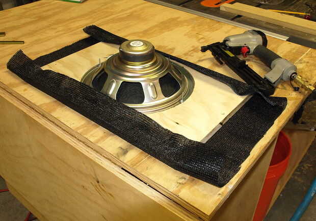 Ponga el altavoz abajo en el material con el tejido y recortarlo dejando un par de pulgadas extra todo alrededor.