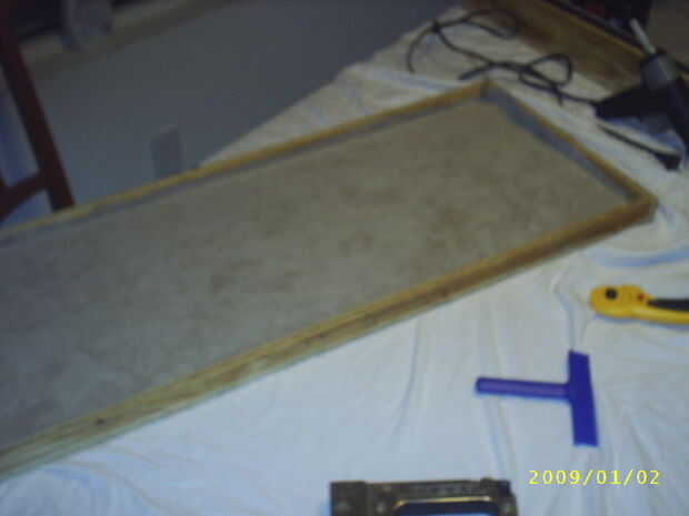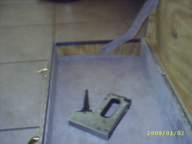 después de tener la mayoría de la tela toma un cartón y cortarlo para que coincida con el ancho de las paredes + 1/2 pulgadas en la parte inferior de la mitad de su caso. El 1/2 pulgada extra es para que poder caber en la parte inferior la tapa algo de tela y envolver alrededor de la cartulina para que exista un pequeño exceso y pegar el exceso en la parte posterior de las tiras de cartón. Luego deslice en su lugar en la parte inferior de la caja y en la grapa. Te preocupes sobre la parte superior trataremos más adelante.