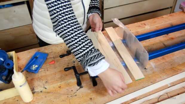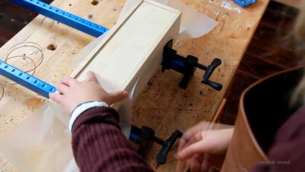 OK, así que tiempo para montar la caja. Así que estoy poniendo abajo poco de pegamento en los surcos enrutados, y entonces simplemente estoy poniendo todas las piezas juntas. Así parece buena. Luego sosteniendo la caja en su lugar con algunas abrazaderas de tipo como el pegamento seca.