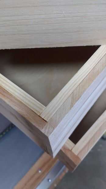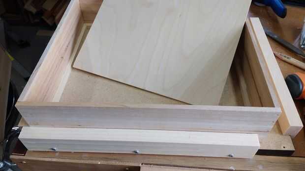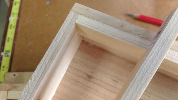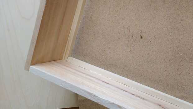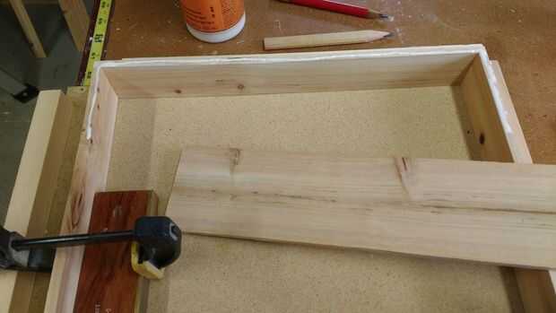 4. antes de que seque, medir, cortar, pegar y pin 4 tiras estrechas de ½" por 1/4 pino alrededor del interior borde del marco. 2 superficies deben quedar al ras. El fondo de la caja será ½' gruesa y, cuando volcó, esto actuará como cuña o repisa para el fondo de la caja de madera contrachapada.