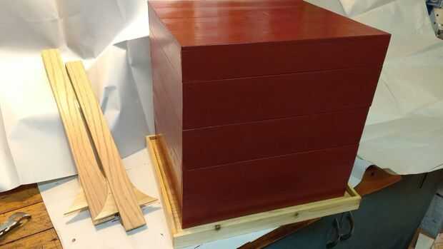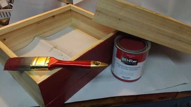 Toda la madera fue tratada con un sellador transparente antes de recibir 2 capas de latex exterior brillo (rojo cereza). Una capa superior de laca spray fue añadida cuando el proyecto estaba completo para aumentar el efecto de brillo que estaba buscando.