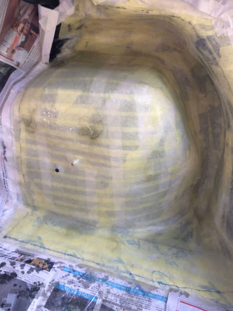 Aplicar la fibra de vidrio sobre el área con cinta hacia fuera. Marqué de los contornos exactos de la caja para darme una mejor idea de donde necesitaba para aplicar la fibra de vidrio. Aplicar unas pocas capas hasta que tenga una sólida base - dejar para secar.