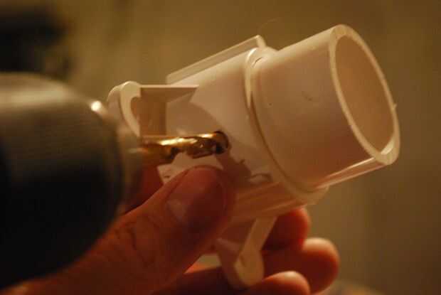 Atornille la tapa de tabla en una tabla o pedazo de madera para sujetarla. Coloque 2.5" muebles grado tubo en la tapa de tabla. Debe ser 'un poco' suelta. A continuación, perfore a través de la tubería de grado tapa de mesa y muebles alrededor de 1/2" del extremo de la tapa de la mesa, a través de ambos lados.