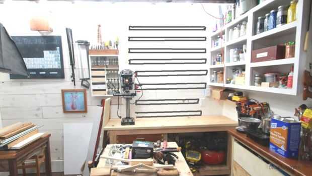 Lo cool es atornillar estas grapas en los postes, y luego puede colgar cosas con una madera de 45 grados detrás toda la pared sin tener que preocuparse de conectar cada uno individualmente a la pared. Puede conectar cualquier cosa a este tablero. Una estantería, un armario, algún tipo de soporte, nada. Y usted puede moverlos alrededor, cambiar cosas, hacer lo que quieras.
