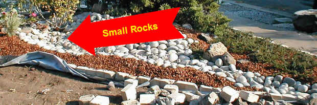 Pone pequeñas rocas y grava, sobre las grandes rocas, relleno entre ellos.
