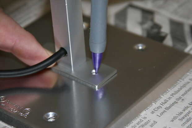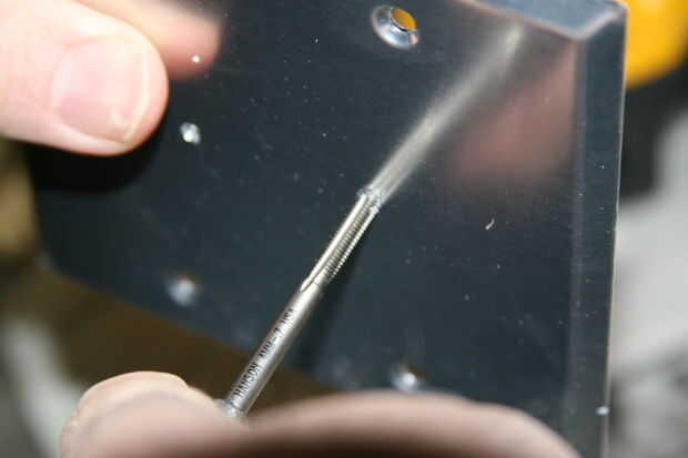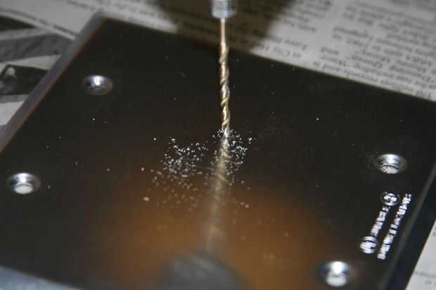 Usando una pluma o un lápiz, trazar los orificios en la parte inferior de la montura donde desee adjuntar a la placa base. Usando la broca #19, taladre un agujero de 4mm por cada marca. Los orificios recién perforados del hilo de rosca con la llave de 4mm. Asegúrese de hilo en la forma en y hacia fuera. Enroscar firmemente la montura en la placa base con los tornillos de 4mm.
