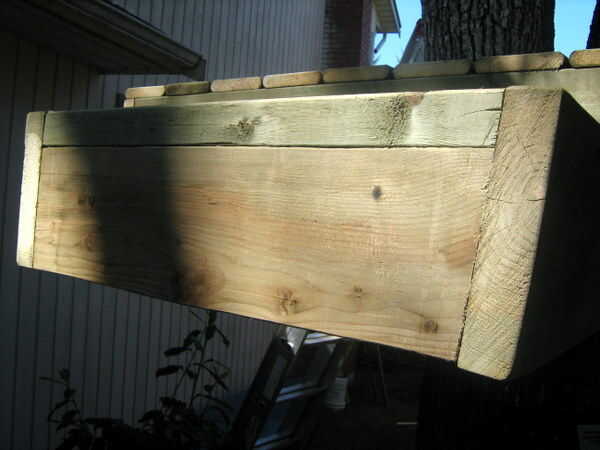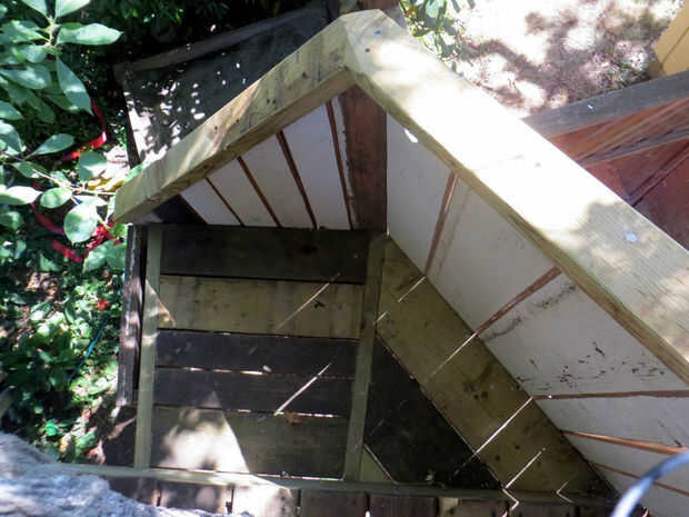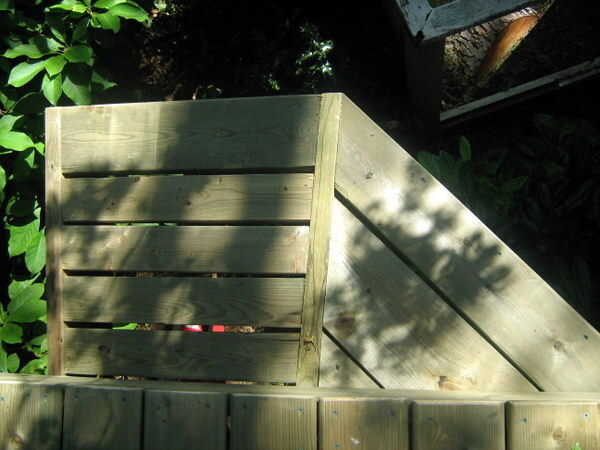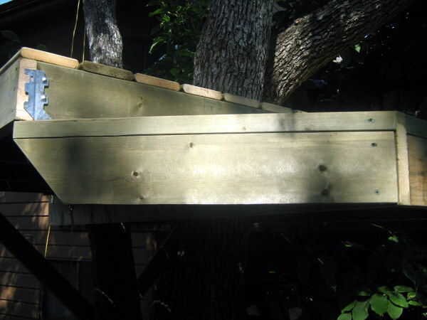 OK, hasta ahora la construcción ha sido muy convencional - todos los libros en treehouses le dirá cómo conseguir esto ahora. Uno de mis favoritos pedacitos fue la siguiente innovación menor. Los dos grandes soportes empujar hacia fuera mucho más allá de la plataforma, y puede utilizar un sistema de estos para hacer un nivel ligeramente inferior para usar como una entrada. Hacer una cubierta pequeña entre las tapas de los soportes a unos 2' hacia fuera, y luego construir diagonalmente hacia la esquina de la casa del árbol. Añadir verticales. Las imágenes cuentan la historia aquí. Sólo utilicé recortes - con un poco de suerte usted será capaz de hacer lo mismo.