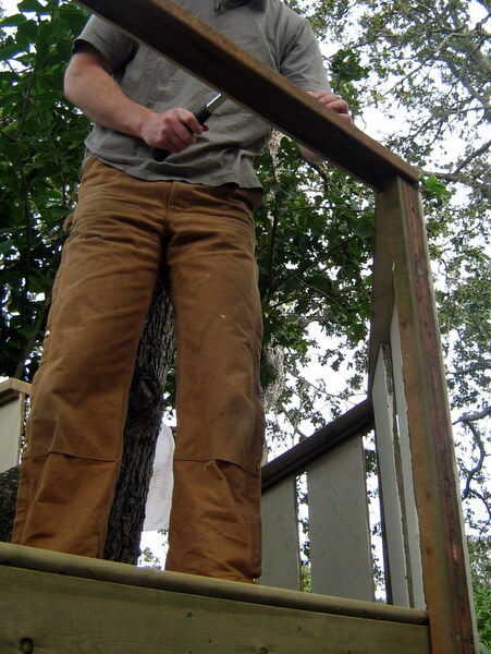 Uso lo que quieres rellenar debajo de la barandilla - cuerda, de madera, cualquiera que sea. Los niños probablemente no deberían ser capaces de deslizarse a través de, aunque. Tuve un montón de tablas de cedro resistido muy bien que a clavado encima. Utilicé tiras de 1 × 1 para sostenerlos en su lugar cualquier lado debajo de la barandilla. La broca sólo complicada era el líder de poco ángulo hasta la plataforma - un poco de ensayo y error, porque es no trivial a la barandilla con los lados de la plataforma.