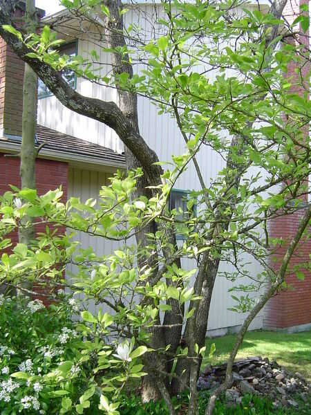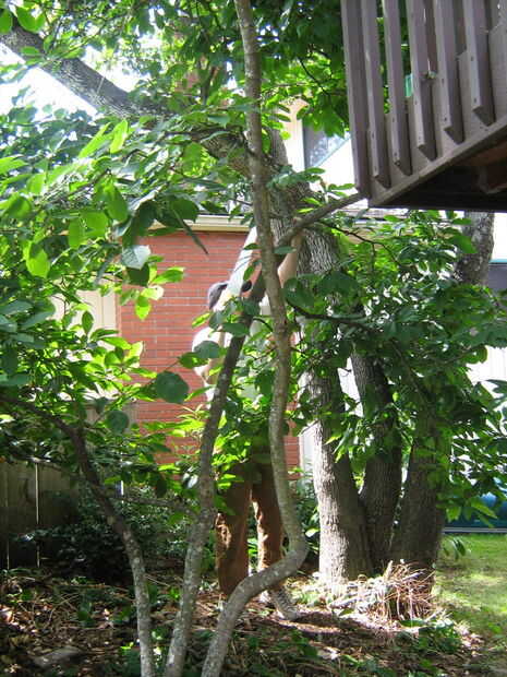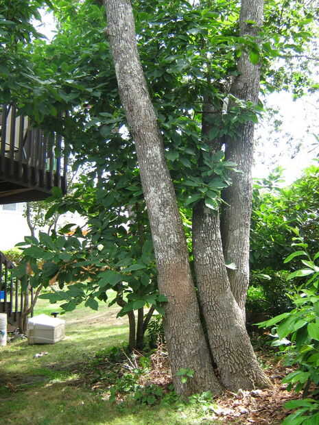 Existen ventajas definidas en el uso de más de un árbol para tu casa del árbol - la casa del árbol puede ser más grande, y usted tiene que utilizar menos refuerzo. El árbol que ves aquí (detrás de la magnolia!) tiene un tronco que se divide en tres en la base y estos troncos biselada hacia fuera un poco a medida que crecen hacia arriba. A la altura de la casa del árbol - unos 9' (2.7 m) de la tierra - se tocar un par de troncos, y el otro es de 4' (1.2 m) lejos. Esto significa que el diseño se ha basado en uno de un par de cerca espaciado de árboles, en lugar de un grupo de tres. El árbol es un roble de Garry y no crecen mucho más al norte que esta (isla meridional de Vancouver), por lo que crecen muy lento aquí. Una sólida colección antibarro de viejos troncos, cada uno de aproximadamente 1' de diámetro en 9 pies para arriba.