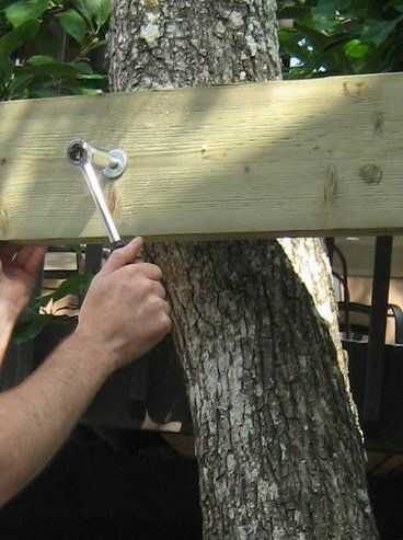 Atornille los tornillos por los agujeros en las juntas y en el árbol con una llave. Utilice arandelas y no perno duro contra el árbol. El espacio que le está dando a crecer es la brecha entre el soporte y el árbol. Cuanto más quieres tu casa del árbol por último, cuanto más debe posarse el apoyo- y más importante sus tirafondos deben ser! Sé que mi árbol sólo crecieron un aproximadamente 1/4"-1/2" de diámetro más de 4 años, pero la mayoría de los árboles crece más rápido que esto. Cuando reconstruyó la casa del árbol con pernos de 3/4", le di unos 1/2" para crecer en cualquier lado. Utilicé tornillos de 10" para los árboles con un perno en ellos, y 8" tornillos para el árbol con dos pernos en él.